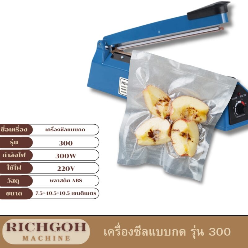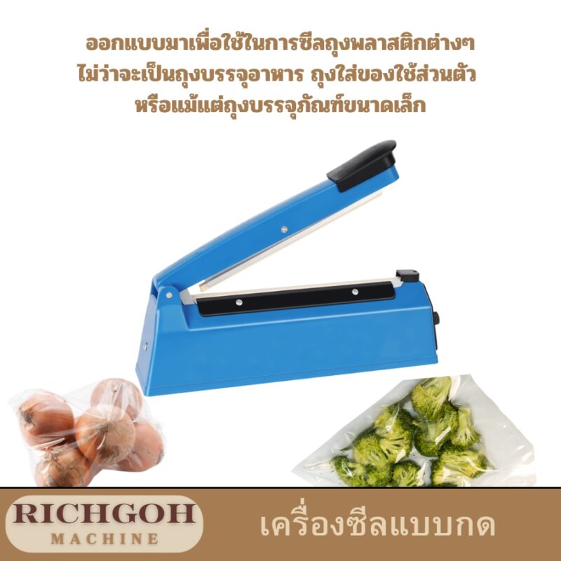 เครื่องซีลแบบกด รุ่น 200-300 เป็นอุปกรณ์ขนาดเล็ก พกพาสะดวก ที่ออกแบบมาเพื่อใช้ในการซีลถุงพลาสติกต่างๆ ไม่ว่าจะเป็นถุงบรรจุอาหาร ถุงใส่ของใช้ส่วนตัว หรือแม้แต่ถุงบรรจุภัณฑ์ขนาดเล็กอื่นๆ โดยมีจุดเด่นคือใช้งานง่าย เพียงแค่กดลงไปบนถุงที่ต้องการซีล ก็จะได้รอยซีลที่แน่นหนา ช่วยป้องกันอากาศเข้าไปในถุง ทำให้อาหารหรือสิ่งของที่บรรจุอยู่ภายในสดใหม่ได้นานยิ่งขึ้น