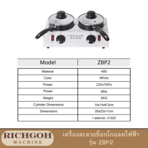 เครื่องละลายช็อกโกแลตไฟฟ้า 2 หม้อ เป็นอุปกรณ์ที่ช่วยให้การละลายช็อกโกแลตของคุณเป็นเรื่องง่าย สะดวก และปลอดภัย เหมาะสำหรับทั้งการใช้งานในบ้าน ร้านอาหาร หรือร้านเบเกอรี่ ด้วยดีไซน์ที่ทันสมัยและฟังก์ชันการใช้งานที่หลากหลาย ทำให้คุณสามารถสร้างสรรค์เมนูขนมหวานได้หลากหลายชนิดตามความต้องการ