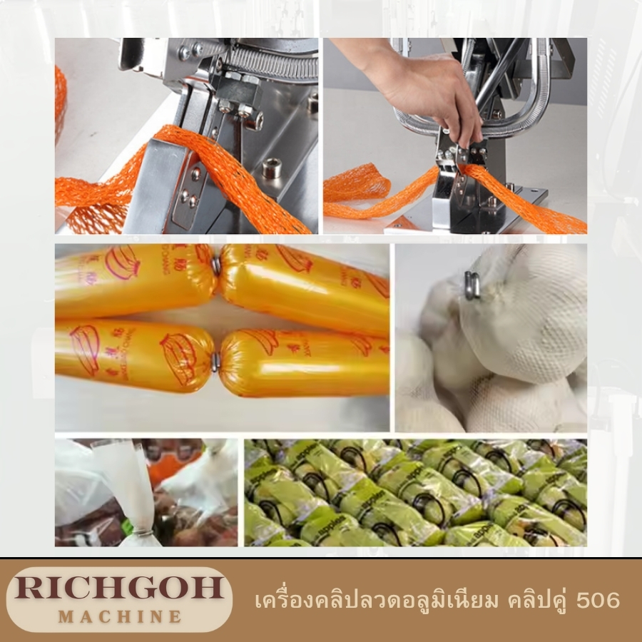 เครื่องคลิปลวดอลูมิเนียม คลิปคู่ 506 เป็นเครื่องจักรที่ออกแบบมาเพื่อรัดบรรจุภัณฑ์ต่างๆ ให้แข็งแรงและมั่นคง โดยเฉพาะอย่างยิ่งสำหรับผลิตภัณฑ์ที่มีขนาดและน้ำหนักที่หลากหลาย เครื่องจักรชนิดนี้จะทำการรัดบรรจุภัณฑ์ด้วยคลิปลวดอลูมิเนียมเบอร์ 506 ซึ่งเป็นคลิปลวดขนาดมาตรฐานที่นิยมใช้กันอย่างแพร่หลาย