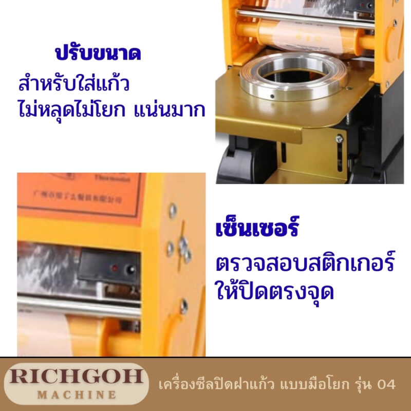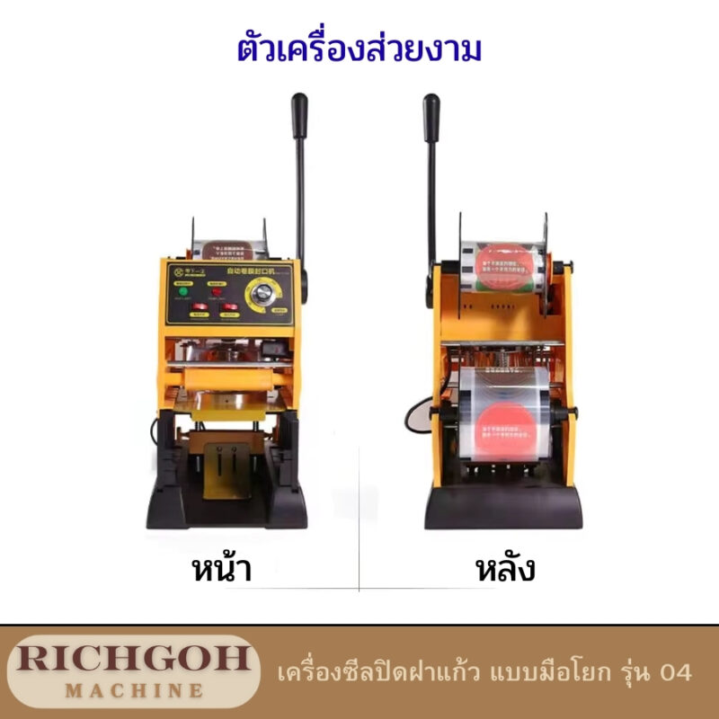 • ใช้งานง่าย: เพียงแค่วางแก้วลงบนแท่น วางฟิล์ม และโยกคันโยก เครื่องก็จะทำการซีลฝาให้คุณโดยอัตโนมัติ