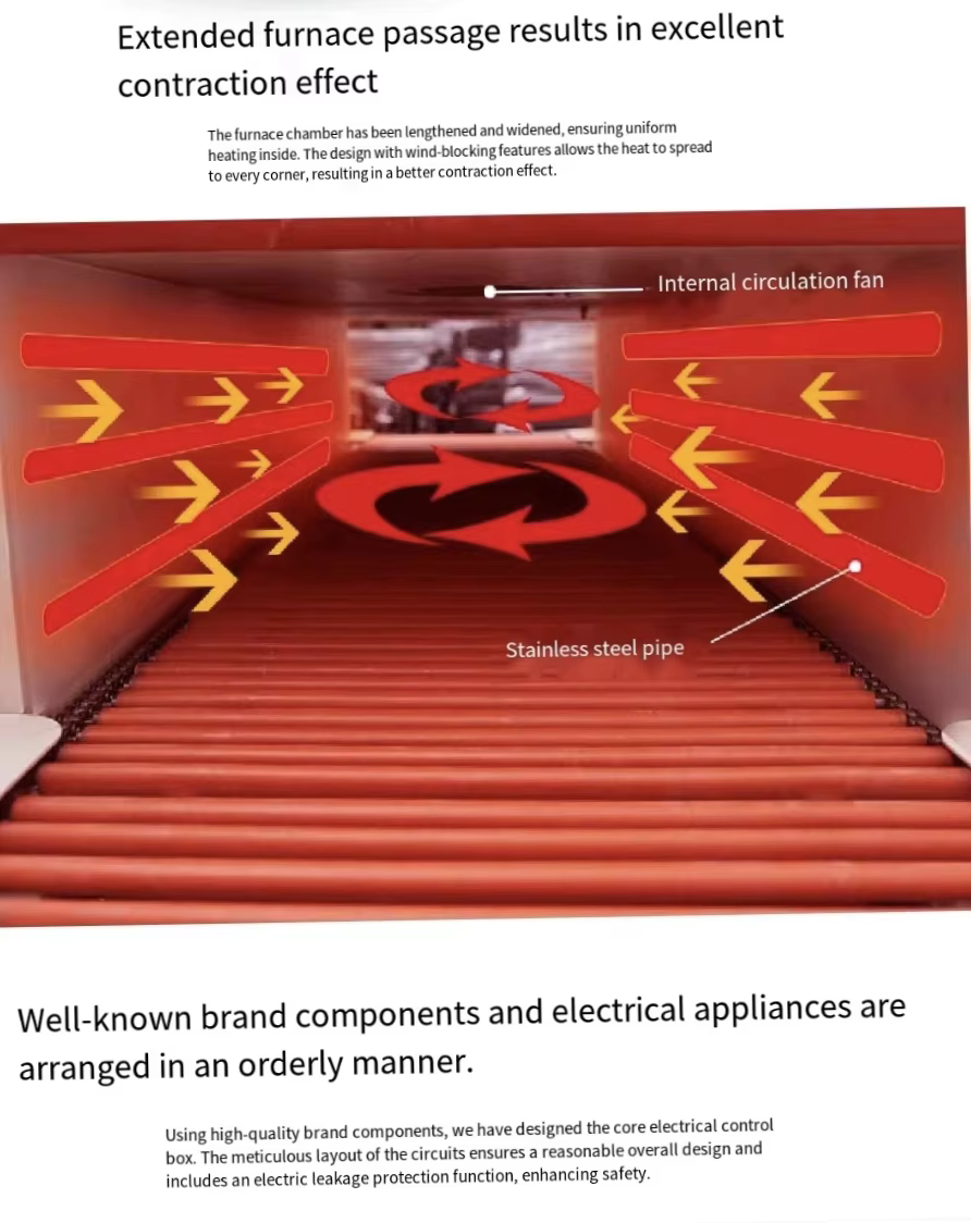 จะทำงานโดยการส่งผลิตภัณฑ์ที่ห่อหุ้มด้วยฟิล์มพลาสติกเข้าสู่ตู้อบที่มีความร้อนสูง ฟิล์มจะได้รับความร้อนและหดตัวจนแนบสนิทกับรูปทรงของผลิตภัณฑ์ ทำให้ได้บรรจุภัณฑ์ที่สวยงามและแข็งแรง